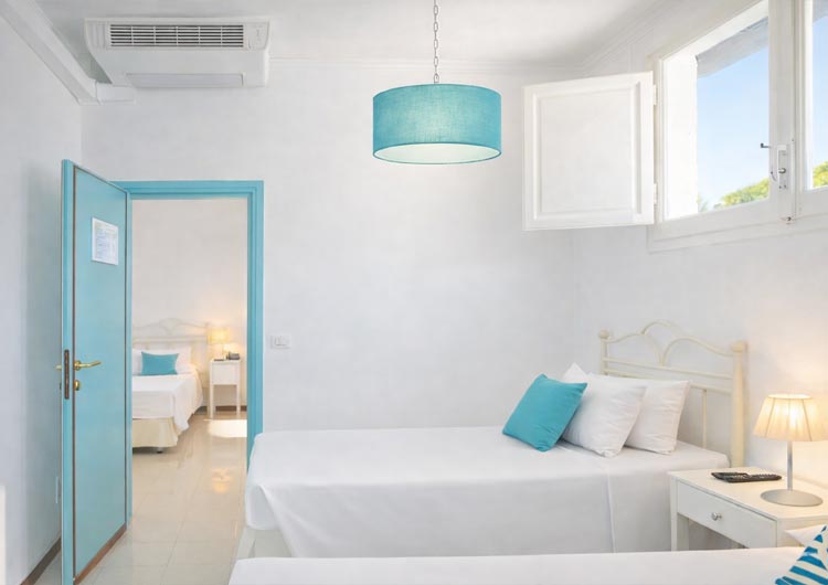 Una soluzione comoda e curata, pensata per famiglie o gruppi fino a 4 persone. Ambiente arredato in stile classico, composto da: ingresso, due camere comunicanti, ognuna dotata di televisore, aria condizionata e balcone privato. Situata nel corpo centrale dell’Hotel, con possibilità di aggiungere una culla su richiesta.